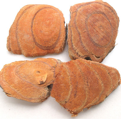药材性状:本品为椭圆形、长矩圆形或不规则的斜切片,厚0.3~lcm。栓皮灰棕色,有的可见灰白色斑,栓皮脱落处显红棕色。切面木部红棕色或棕色,导管孔多数;韧皮部有树脂状分泌物呈红棕色至黑棕色,与木部相间排列呈3~8个偏心性半圆形环;髓部偏向一侧。质坚硬。气微,味涩。