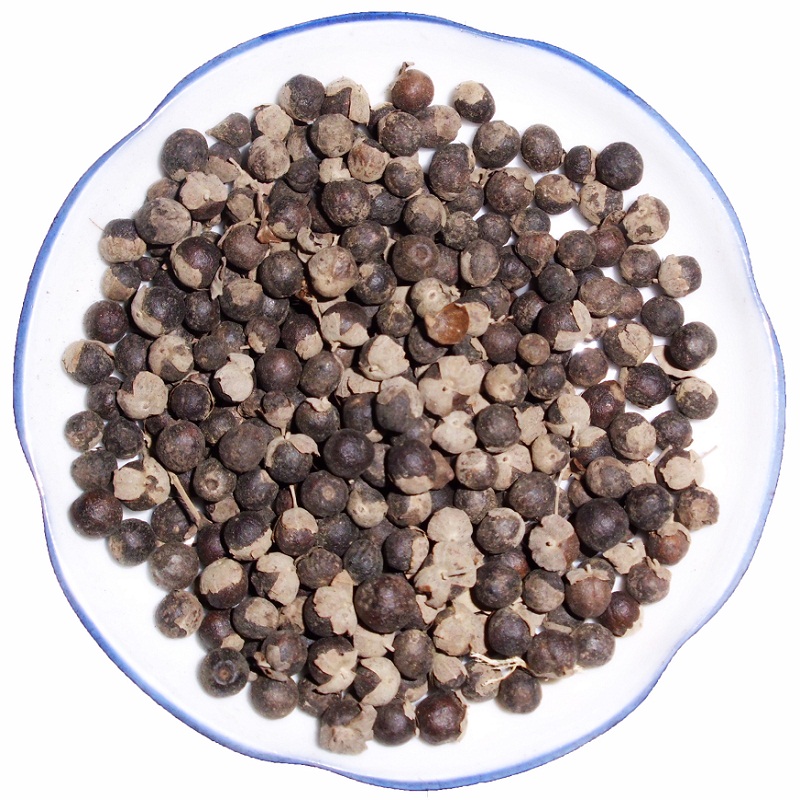 【药材】干燥果实圆球形,直径4~6毫米。表面灰黑色或黑褐色,被灰白色粉霜,有4条纵沟;用放大镜观察,密布淡黄色小点。底部有薄膜状宿萼及小果柄,宿萼包被果实的1/3~2/3,边缘5齿裂,常深裂成两瓣,灰白色,密生细柔毛。体轻,质坚韧,不易破碎,横断面果皮灰黄色,有棕褐色油点,内分四室,每室有种子1枚,种仁白色,有油性。气特异而芳香,味淡微辛。以粒大、饱满、气芳香、无杂质者为佳。