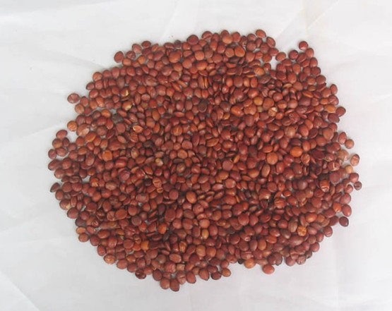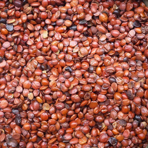【药材】干燥成熟的种子呈扁圆形或椭圆形,长5~9毫米,宽5~7毫米,厚约3毫米,表面赤褐色至紫褐色,未成熟者色浅或发黄,光滑。一面较平坦,中央有一条隆起线或纵纹,另一面微隆起,边缘略薄,先端有明显的种脐,另一端具微突起的合点,种脊位于-侧不明显。剥去种皮,可见类白色胚乳粘附在种皮内侧。子叶两片,类圆形或椭圆形,呈黄白色,肥厚油润。气微弱,味淡。以粒大饱满、外皮紫红色、无核壳者为佳。