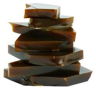 【药材】呈整齐的长方形块状,通常长约8.5厘米,宽约3.7厘米,厚约0.7或1.5厘米。表面棕黑色或乌黑色,平滑,有光泽。对光照视略透明。质坚脆易碎,断面棕黑色或乌黑色,平滑,有光泽。气微弱,味微甜。以色乌黑、光亮、透明、无腥臭气、经夏不软者为佳。