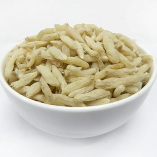 【性状】本品呈纺锤形,两端略尖,长1.5~3cm,直径0.3~0.6cm。表面黄白色或淡黄色,有细纵纹。质柔韧,断面黄白色,半透明,中柱细小。气微香,味甘、微苦。