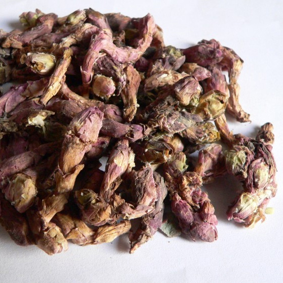 【药材】干燥花蕾呈不整齐棍棒状,常2~3个花序连生在一起,长1~2.5厘米,直径6~10毫米。上端较粗,中部稍丰满,下端渐细或带有短梗。花头外面被有多数鱼鳞状苞片,外表面呈紫红色或淡红色。苞片内表面布满白色絮状毛茸。气清香,味微苦而辛,嚼之显棉絮状。以朵大、色紫红、无花梗者为佳。