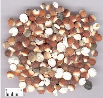 药材性状:本品呈类球形,多为破粒,完整者直径5~8mm。表面有棕红色内种皮,一端黄白色,约占全体1/3,有凹点状的种脐痕,除去内种皮显白色。质较硬,断面白色,粉性。无臭,味淡。