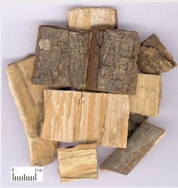 药材性状:本品呈不规则板片状、槽状或半卷筒状,长宽不一,厚2~6mm。外表面灰棕色或灰褐色,粗糙,有交织的纵皱纹及点状灰棕色皮孔,除去粗皮者淡黄色;内表面类白色或淡黄色。质韧,不易折断,断面纤维性,呈层片状,易剥离。无臭,味苦。