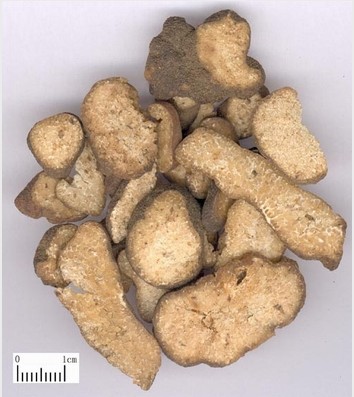 药材性状:本品为类球形或不规则团块,直径1~3cm。表面黑褐色或灰褐色,有略隆起的网状细纹。质坚实,不易破裂,断面不平坦,白色或浅灰黄色,似粉状或颗粒状,常有黄棕色大理石样纹理。无臭,味微苦,嚼之有颗粒感,微带黏性,久嚼无渣