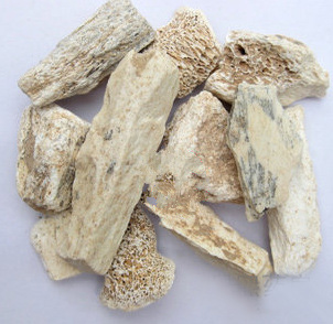 【药材】呈完整的齿状或破碎成不规则的块状。完整者可分为犬齿与臼齿。犬齿呈圆锥形,先端较细或略弯曲,长约7厘米,径约3厘米,近尖端处常中空。臼齿呈圆柱形或方柱形,一端较细,略弯曲,长约5厘米,多有深浅不同的沟棱。其中呈青灰色者习称"青龙齿",呈黄白色者习称"白龙齿"。有的表面尚具光泽的珐琅质。质坚硬,断面粗糙,凹凸不平,或有不规则的突起棱线,吸湿性强。无臭,无味。以不带牙床、吸湿性强者为佳。习惯以青龙齿品质较好。