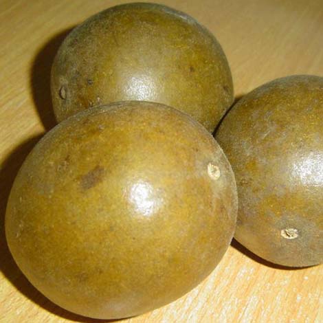 【药材】干燥果实,圆形至长圆形,径5~8厘米,外表黄褐色至深棕色,较光泽,微具残留毛茸,少数有较深色的纵条纹。顶端膨大,中央有一圆形的花柱基痕,基部略狭,有果柄痕。质脆易碎,破碎后内表面黄白色,疏松似海绵状。除去中果皮,可见明显的纵脊纹10条。种子扁平,矩圆形或类圆形,棕色,边缘较厚,中央微凹,内有子叶2枚。味甜。以形圆、个大、坚实、摇之不响、色黄褐者为佳。