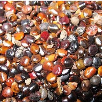 呈扁平圆形,背面稍隆起,腹面较平,直径 3~5毫米,厚约2毫米。表面红棕色至红褐色,平滑光泽,基部有描圆形点状的种脐,顶端有微凸的合点,腹面有一条纵行而隆起的种脊。种皮坚硬,厚约1毫米,胚乳乳白色,油质,其内包围有2片肥厚的子叶,呈淡黄色至草绿色,亦油质。气微弱,味苦而涩。