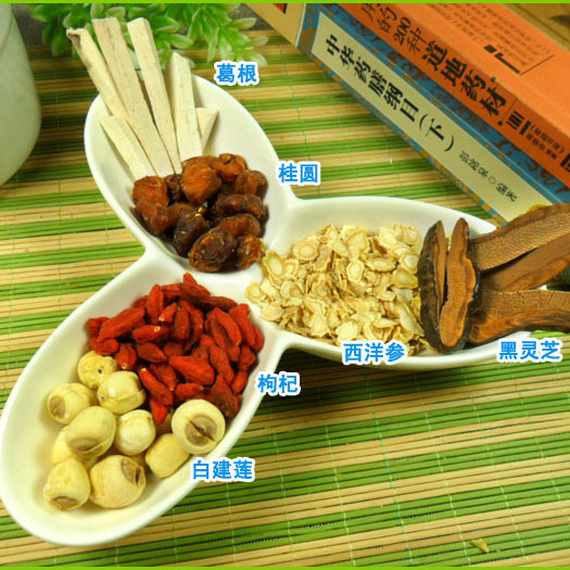 材料组成:西洋参、灵芝、白莲子、枸杞、葛根、桂圆。